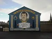 McCullough's death would see him feted as a loyalist hero.[19] At a time when the West Belfast Brigade was stagnating there was no direct retaliation attack. A young member, Gary Smyth, suggested driving up the republican Falls Road and opening fire on people waiting at a bus stop but his superiors vetoed the idea, leading to Smyth leaving the UDA.[20] McCullough was given a full UDA funeral and was buried with a scarf and rosette of Liverpool F.C., of whom he was a supporter.[21] McCullough is commemorated on a mural close to his home on Denmark Street.[22] A UDA statement in 2003, released after the killing of Alan McCullough by UDA members, stated that "Bucky McCullough is a loyalist icon and very much revered within the loyalist community".[23]