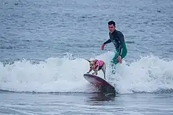 The surfing contest is divided into up to four dog weight classes, plus a tandem dog and a tandem dog and human contest. There are also a fetch contest and a fashion show.[1] Dogs surf with the assistance of a human who selects the wave or waves for the dog to ride.[2] In the non-tandem portion of the contest, first, second, and third place are awarded in each weight class based on ride length, technique, and attitude as well as wave size during a ten-minute heat, and the top two dogs in each class then compete for the Top All-Around Surfing Championship Awards.[3] The event raises money for animal, surfing, and environmental charities.[4][5]