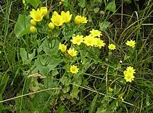 Yellow-wort grows 10–50 cm (3.9–19.7 in) tall, with stiff, branching stems. The leaves are glaucous, opposite and entire, the upper ones perfoliate, being united at the base. It bears terminal cymes of bright yellow, stalked flowers, 1–1.5 cm (0.39–0.59 in) across. The calyx is deeply divided into 6–10 linear lobes or sepals, spirally arranged, free or nearly free from each other at the base and shorter than the corolla. The petals number six to ten and form a short tube. There are six to ten adherent stamens and a two-lobed stigma.[2]